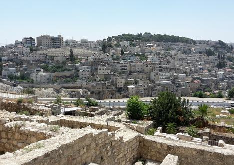 De Olijfberg is feitelijk een bergrug die bestaat uit drie gedeelten. Het noordelijke deel wordt nu Scopusberg genoemd. Het middelste deel wordt nu als 'Olijfberg' aangeduid. Op deze foto is het zuidelijke gedeelte te zien: de 'Berg van het Verderf', zo genoemd omdat koning Salomo hier tempels liet bouwen voor allerlei afgoden (1 Koningen 11: 7-9). Dit deel van de Olijfberg is nagenoeg even hoog als de Tempelberg en maakt nu deel uit van de Arabische wijk Silwan. Deze foto is genomen vanaf de trappen die naar de tempel van de HERE leidden. Zo'n 350 jaar stonden hier, zó dicht bij elkaar, de tempel van de HERE en de tempels voor de afgoden. Deze tempels werden pas door koning Josia afgebroken (2 Koningen 23: 13).